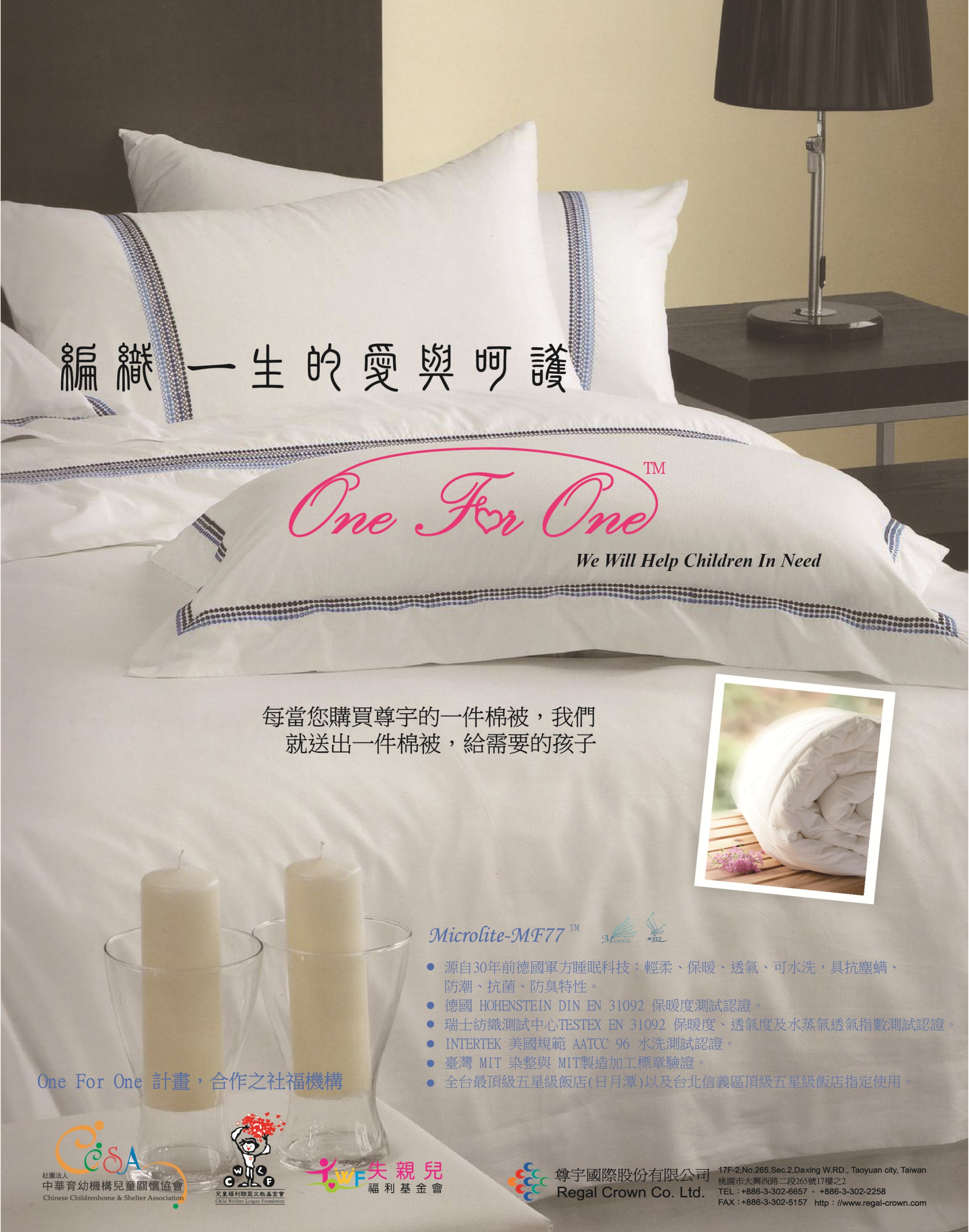 - ONE FOR ONE計畫之刊登於媽媽寶寶雜誌:每當您購買尊宇的一件棉被,我們就送出一件棉被,給台灣需要的孩子(2013.12)